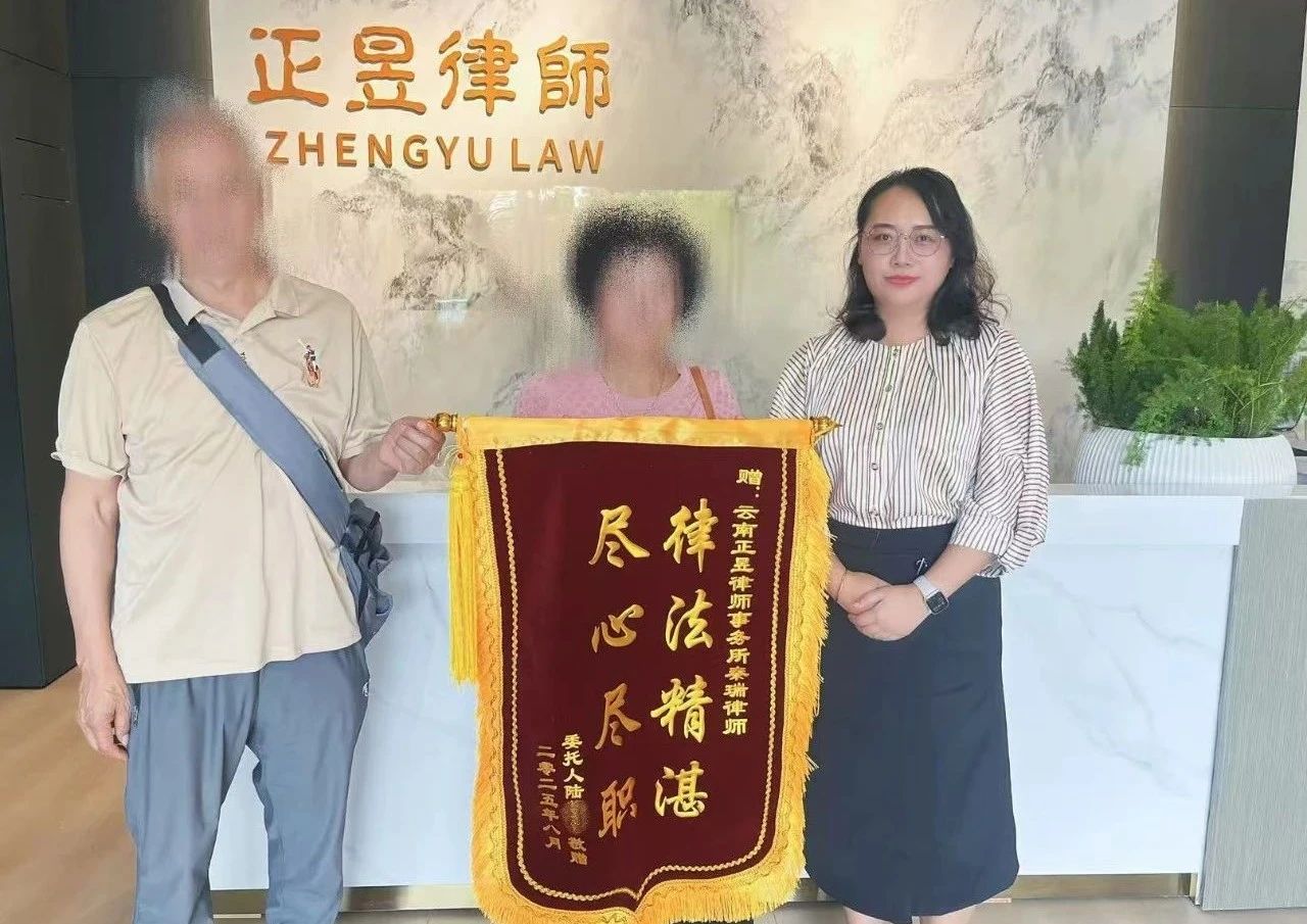 2025年8月12日下午,当事人陆女士、徐先生专程来到云南正昱律师事务所,将一面绣有“律法精湛、尽心尽职”的鲜红锦旗郑重交到秦瑞律师手中,对秦律师在一起机动车交通事故责任纠纷案中的专业表现与敬业精神表达诚挚感谢。